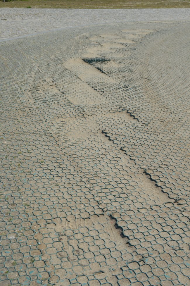 Rede no piso do parque de estacionamento do campo de jogos do Âncora-Praia deteriorada.
