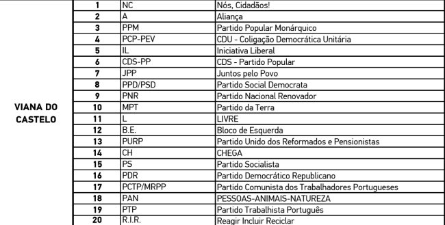 Listas dos partidos concorrentes às Eleições Legislativas pelo Distrito de Viana do Castelo