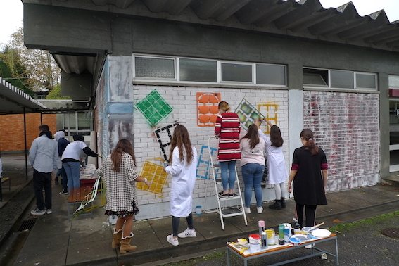 Sob o olhar simultaneamente surpreendido e admirativo de colegas, professores e assistentes operacionais, as aluna(o)s dos 11º B e 12º B escolheram para se expressar duas paredes de gaveto no pavilhão C, que em breve serão demolidas quando do arranque das previstas obras do edifício da escola, completando-se então a intervenção artística efémera.