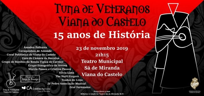 No ano em que comemora 15 anos de existência a TUNA DE VETERANOS DE VIANA DO CASTELO ( oficialmente a primeira cuarentuna portuguesa e a única instituição portuguesa a fazer parte da Federação Internacional de Cuarentunas ), vai culminar uma série de iniciativas, com um espectáculo no Teatro Sá de Miranda no próximo dia 23 Novembro pelas 21h30.