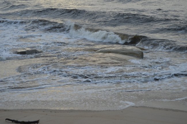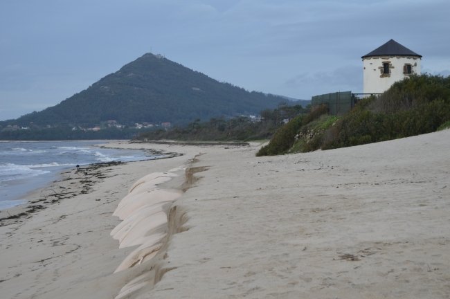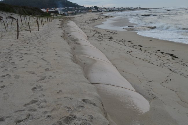 Os geotubos colocados em 2014 a norte do paredão de Moledo encontram-se à vista, depois de a forte ondulação ter retirado a areia que os cobria, e ter posto também à mostra os penedos habitualmente enterrados, conforme documentam as fotos colhidas na tarde do dia 17.