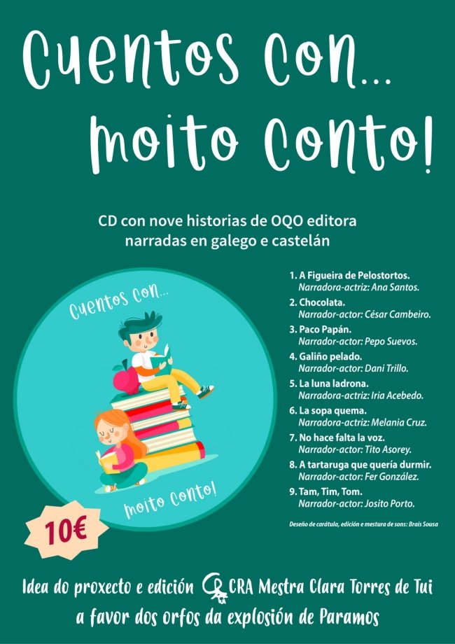 "Cuentos con moito conto" é o título do cd solidario que vén de editar o CRA Mestra Clara Torres de Tui con nove historia de OQO editora narradas en galego e castelán. Porase á venda ao prezo de 10€ e os fondos recadados serán para os dous nenos que quedaron orfos na explosión rexistrada o pasado ano en Paramos.