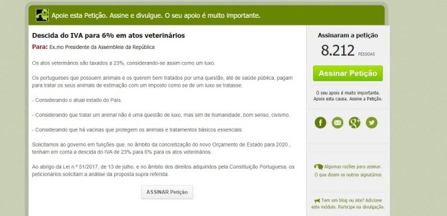Segundo as peticionárias, " os atos veterinários são taxados a 23%, considerando-se assim como um luxo. Os portugueses que possuem animais e os querem bem tratados por uma questão, até de saúde pública, pagam para tratar os seus animais de estimação com um imposto como se de um luxo se tratasse" .