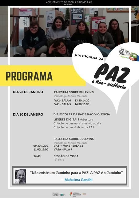 No passado dia 30 de janeiro a equipa Líderes Digitais, formada pelos alunos da turma B do sexto ano da Escola Básica e Secundária do Vale do Âncora, sob a orientação da docente Maria José Esteves, celebraram o Dia Escolar da Não-Violência e da Paz.