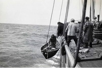 Neste dia não houve aquela aquela pressurosa e habitual movida para arriar. O mar apenas desalinhado por uma ligeira viração de norte, com pequena rebentação baixa aqui e ali, apresentava-se bom para a pesca. E os dóris foram lançados à água e fizeram-se à vela e a remos espalhando-se por um círculo de cerca de quatro milhas à volta do navio, conforme o seu palpite, porque aqui, agora, cada pescador é o capitão do seu dóri.