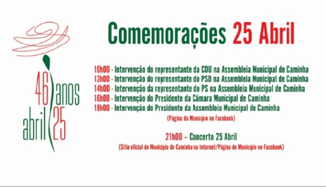 O Município de Caminha vai comemorar os 46 anos do 25 de Abril através das redes sociais e do seu site oficial. Tendo em conta o estado de emergência que o país vive há algumas semanas e as recomendações da Direção Geral de Saúde, a Assembleia Municipal de Caminha decidiu não realizar a cerimónia protocolar habitual, não havendo lugar ao hastear da bandeira em Caminha e Vila Praia de Âncora nem à sessão solene que juntava os autarcas e a população. No entanto, num trabalho conjunto da Mesa da Assembleia Municipal e da Câmara Municipal de Caminha, foi decidido manter as celebrações desta importante data de modo a evidenciar a vitória da Liberdade, da Democracia e de um Povo.