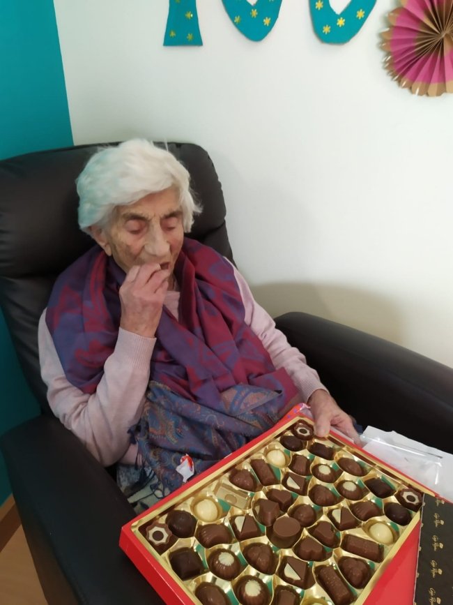 María Gregorio López vive no Geriátrico Residencial Tomiño (barrio da Salgosa). O día 16 de abril cumpriu 100 anos. Debido ao confinamento, tivo que celebrar o seu centenario sen a presenza dos seus tres fillos: Fermín, Jose M. e Mª Joaquina. A Concellería de Benestar Social, que dirixe Cristina Martínez, fíxolle chegar un pequeno agasallo (unha caixa de bombóns) a través de dous voluntarios de Protección Civil Tomiño, que tamén lle levaron unha tarxeta de felicitación, desexándolle que continúe con boa saúde, coma ata agora, e moito ánimo para sobrelevar estes momentos difíciles.