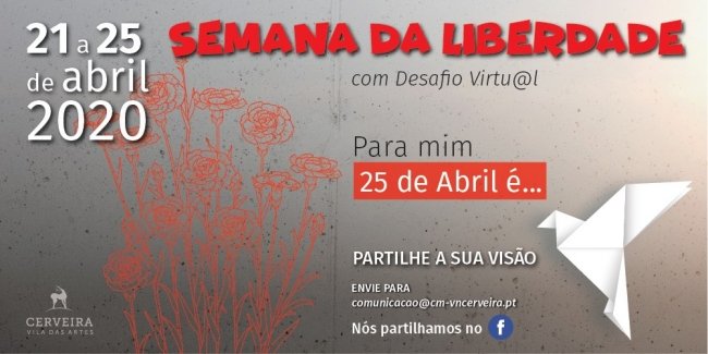 Em período de isolamento e distanciamento sociais, a liberdade não deve ficar confinada. Assim, a iniciativa da Semana da Liberdade com Desafio Virtual pretende incentivar a população a partilhar a sua visão do que foi, é ou será o 25 de Abril, através de diversas artes performativas, como a música, a dança, a literatura, o desenho, o cinema, entre outros.
