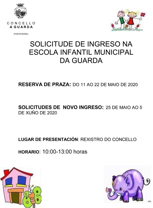 O departamento de Servizos Sociais do Concello da Guarda informa da apertura do prazo para solicitar praza na Escola Infantil Municipal para o vindeiro curso 2020/21.